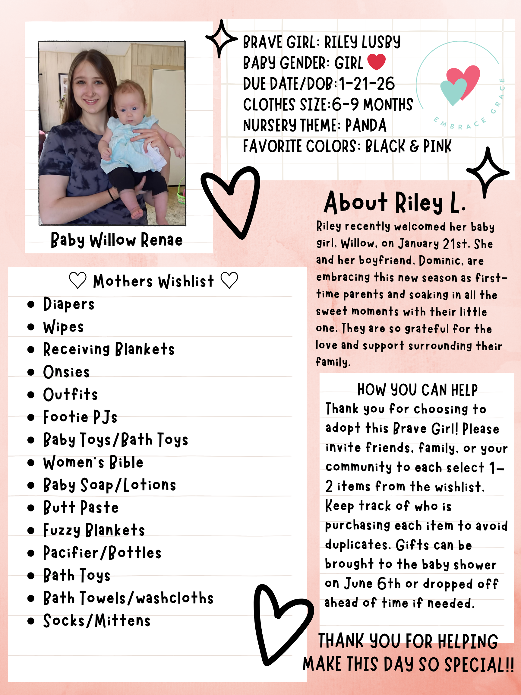 We are excited to celebrate and support our amazing Embrace Grace girls as they prepare for this new season of motherhood. Please join us for a joyful afternoon filled with love, encouragement, and gifts.